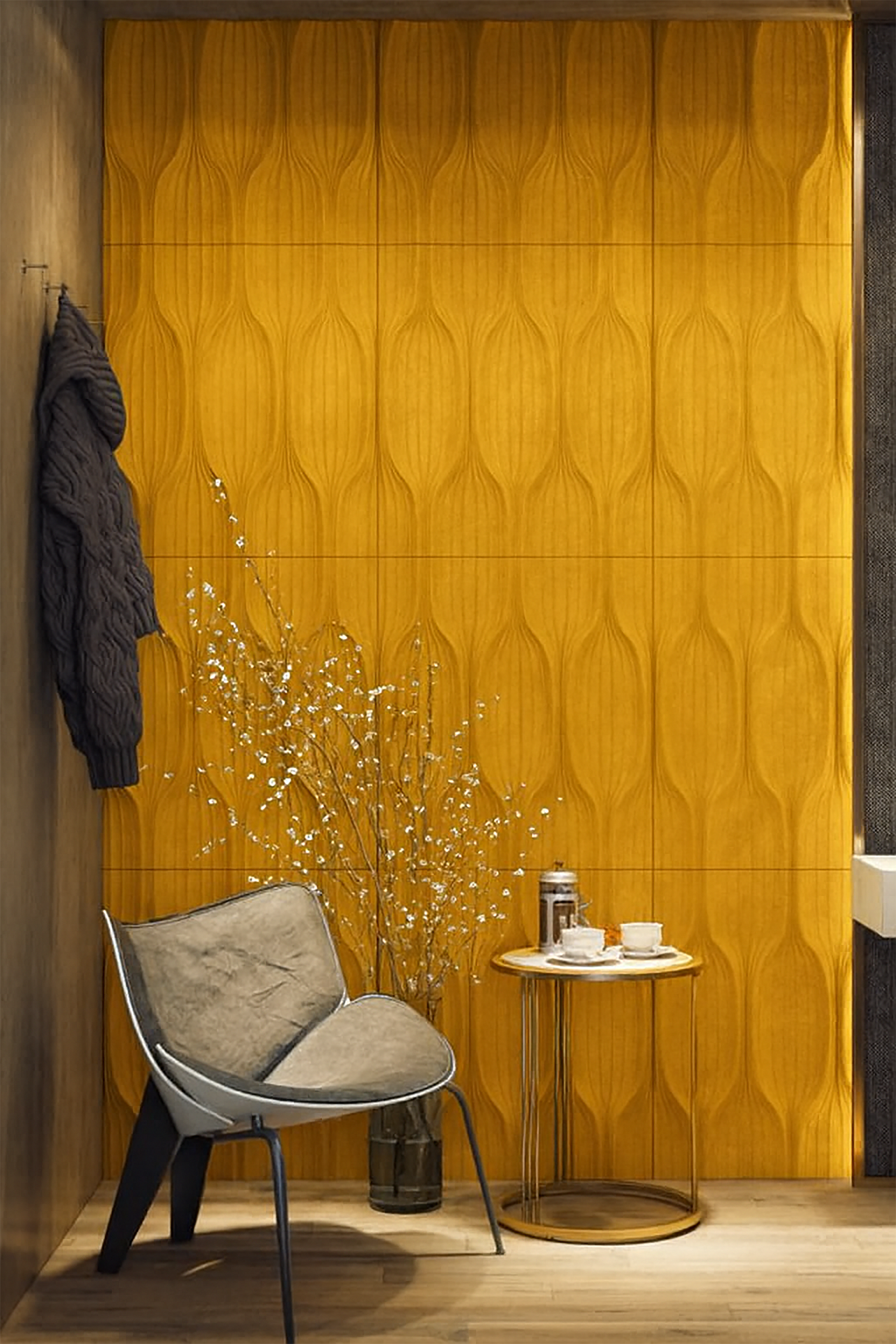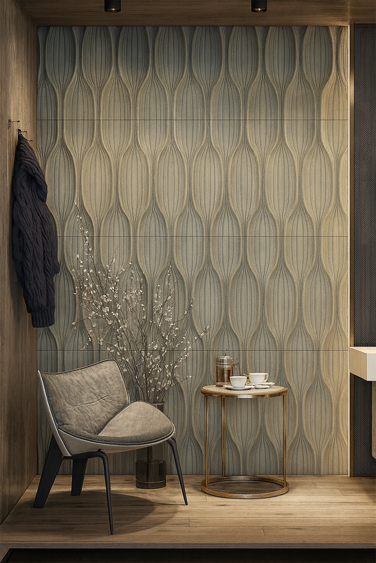 این پنل بهصورت شیارهای منظم طراحی شده و جلوهای شبیه آجر اما بسیار یکدستتر و دقیقتر ایجاد میکند.
